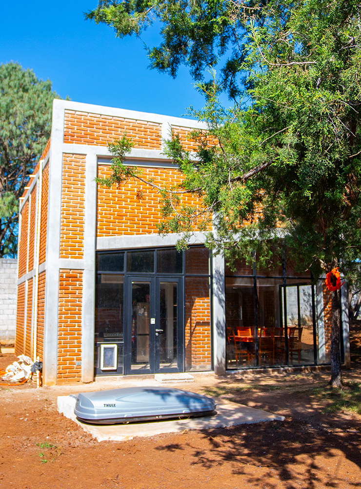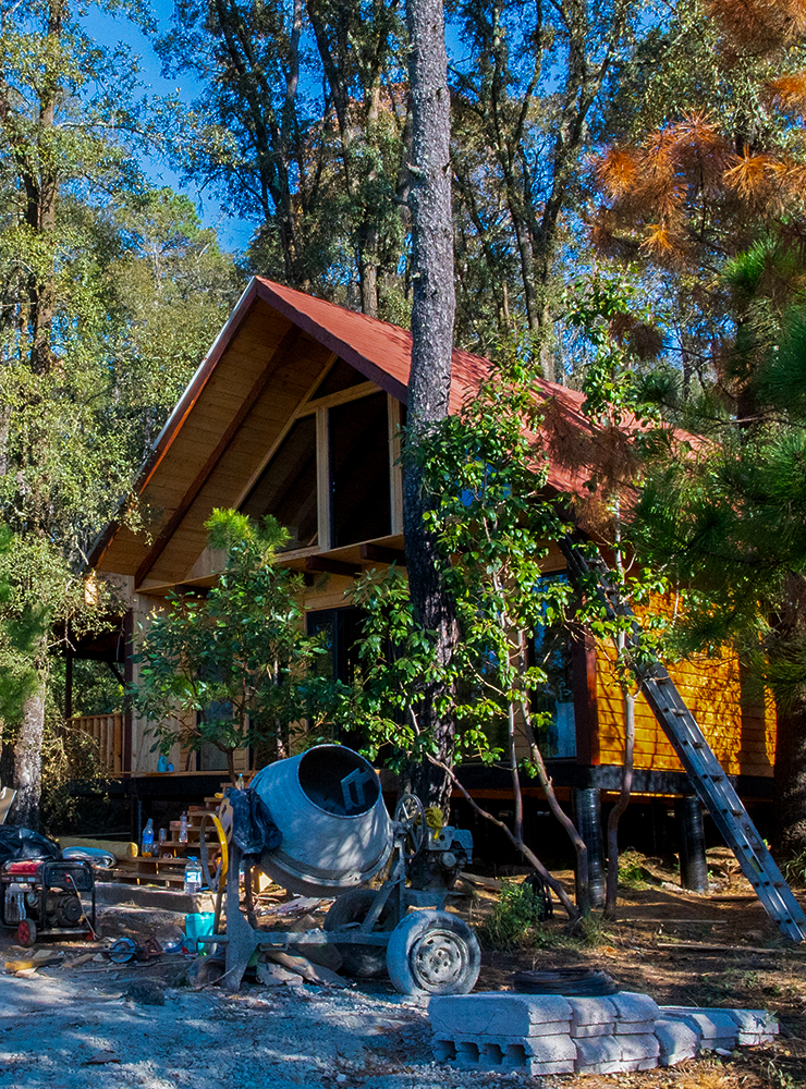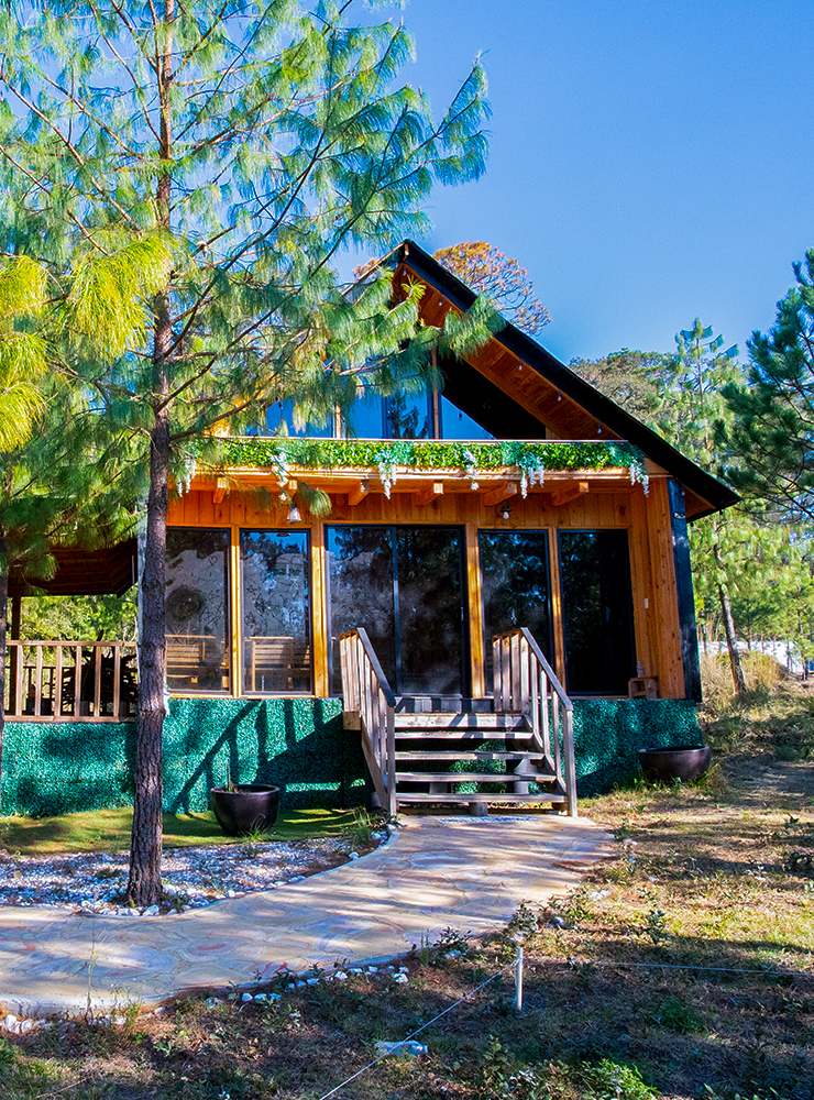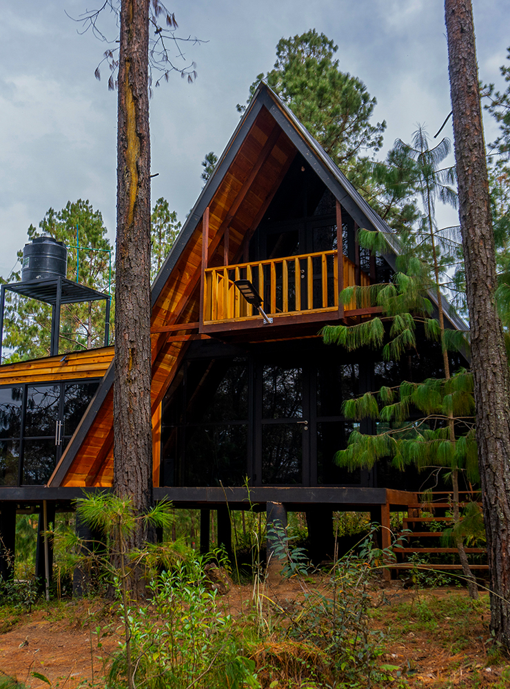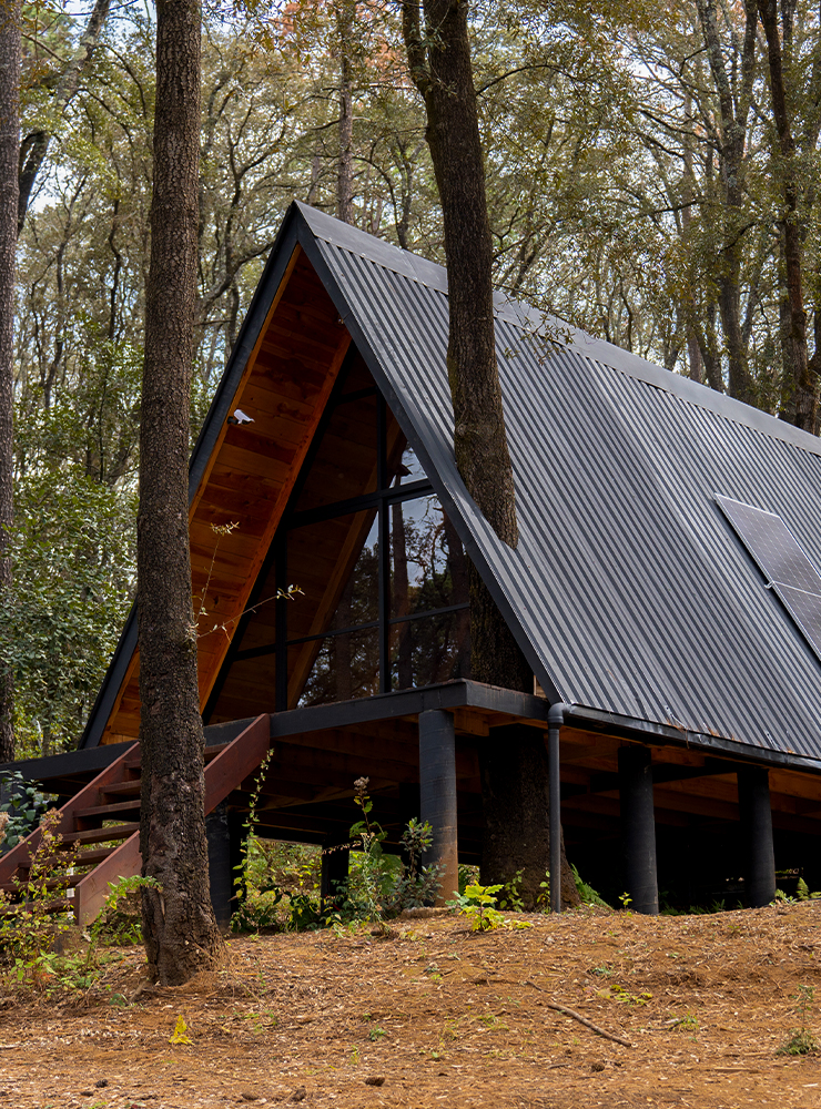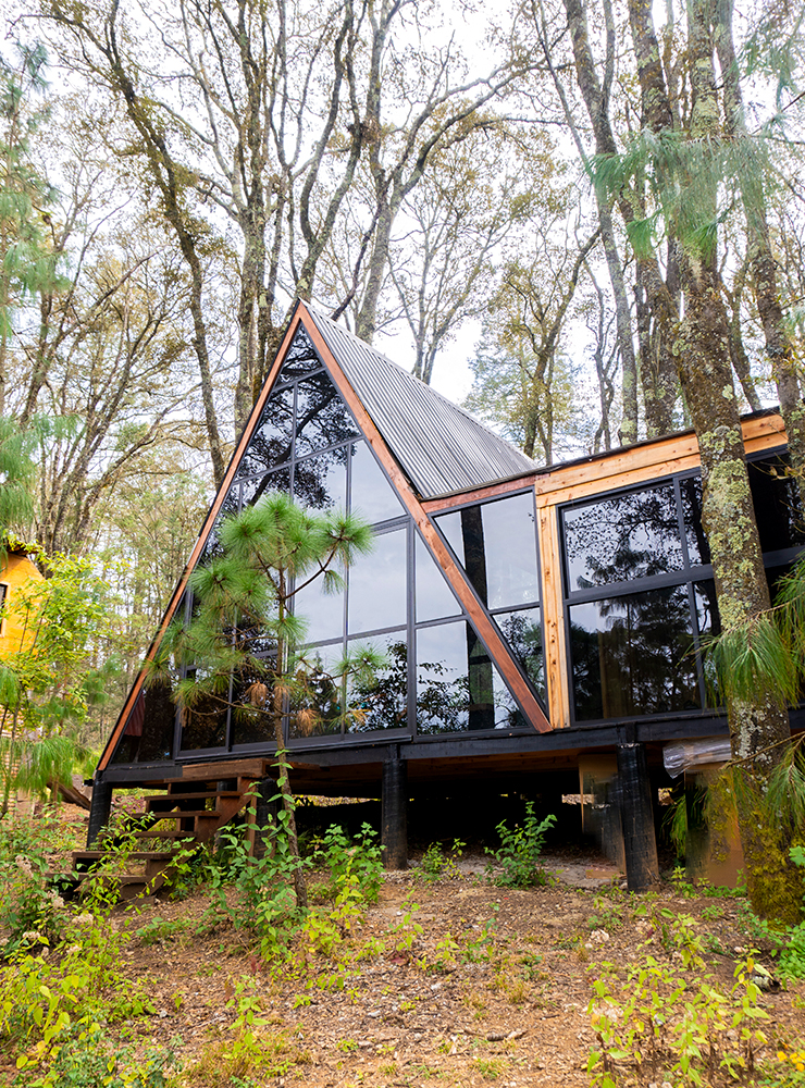 Planta Baja: Estancia, comedor-cocina y baño completo. Acceso principal mediante puerta corrediza de cristal. Estancia con ventanal de piso a techo. Comedor-cocina con vista hacia el exterior. Baño completo a la izquierda de la cabaña.