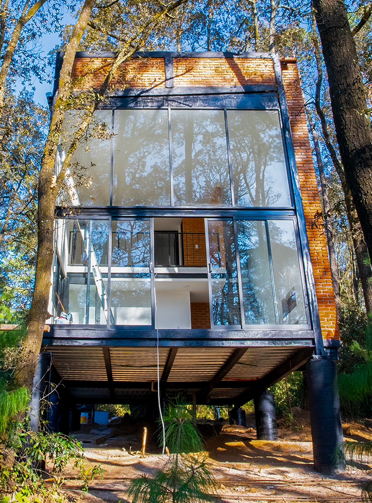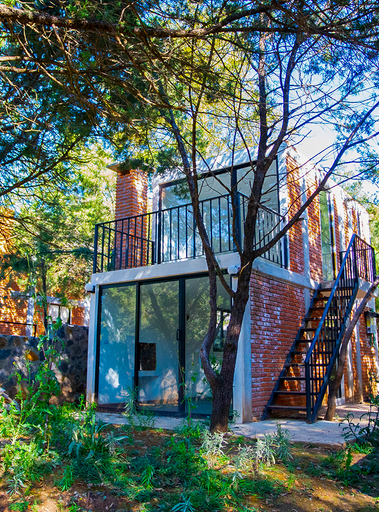 Planta Baja: Estancia con chimenea y ventanal de cristal de piso a techo para iluminación natural y vista al exterior. Cocina-comedor adyacente. Una habitación con amplio espacio y ventilación natural, junto a un baño completo.