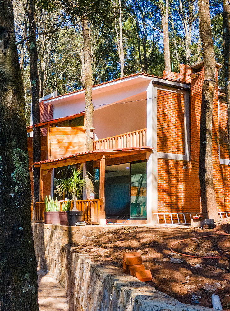 Planta Baja: Estancia, cocineta con barra y baño completo. Acceso por puerta corrediza de cristal. Estancia con chimenea, ventanal de piso a techo. Escaleras exteriores adosadas al muro.